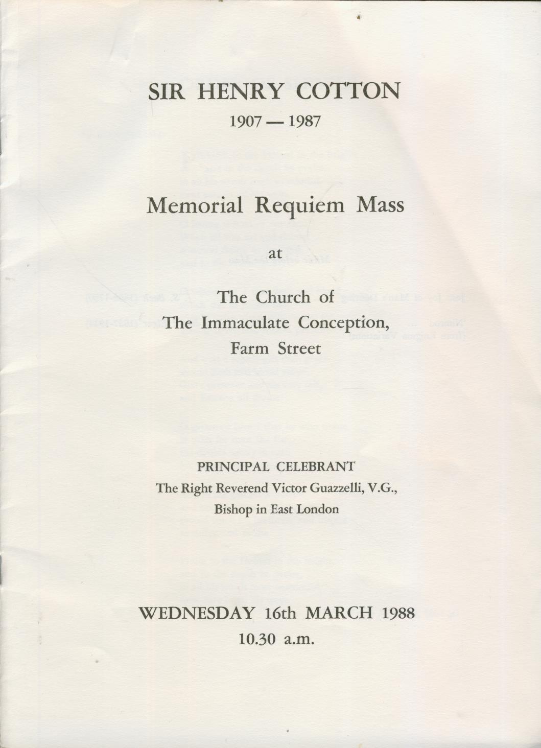 Order of Service for a Memorial Requiem Mass for the life of Sir Henry Cotton, held at the Church of the Immaculate Conception, Farm Street, on March 16th 1988. Also contains a separate prayer card.